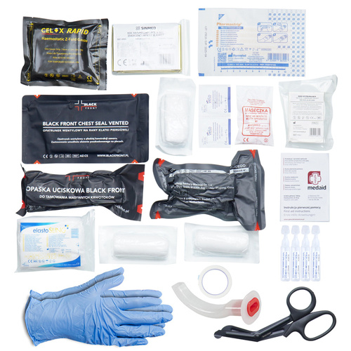 Wewnątrz znajduje się 16 elementów dobranych przez ratowników medycznych. Pozwala udzielić pomocy w skaleczeniu, zwichnięciu, skręceniu, złamaniu, hipotermii, zaproszeniu oka, zatrzymania krążenia i zranień.